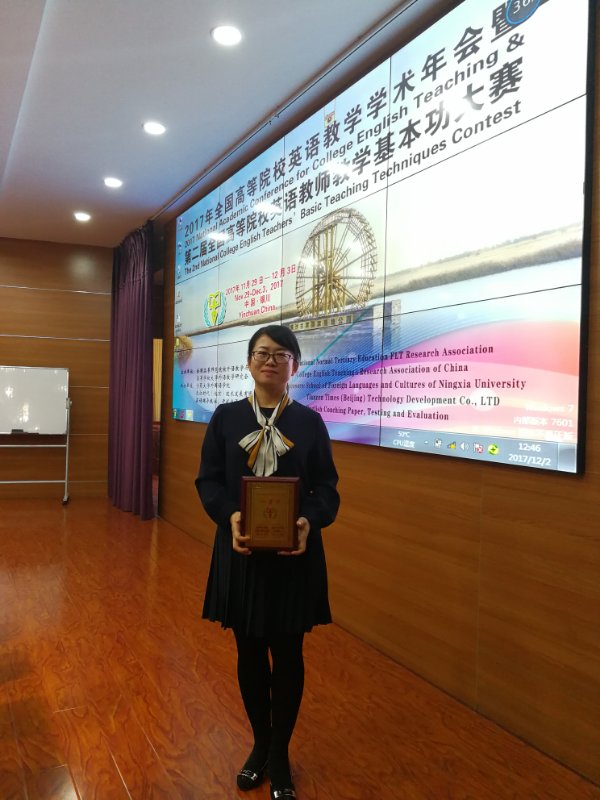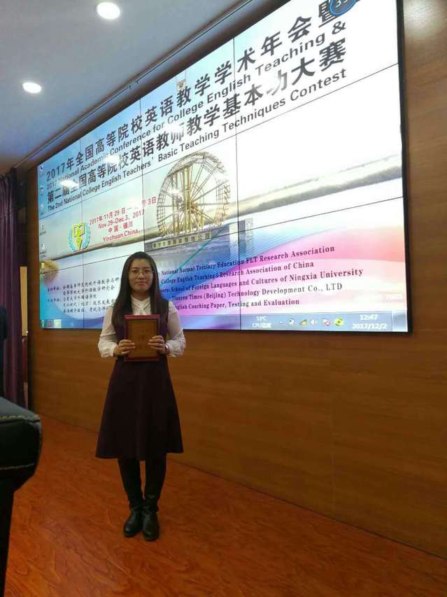 “2017 年全国高等院校英语教学学术年会暨第二届全国高等院校英语教师教学基本功大赛”于2017年11月29日-12月3日在宁夏大学召开。大赛分“基本功大赛”和“精品课大赛”两种组别。根据教师现场授课教学基本功水平及教学效果、依据教师教学技能评价标准,由资深专家、参会教师代表和听课学生三方评分。
