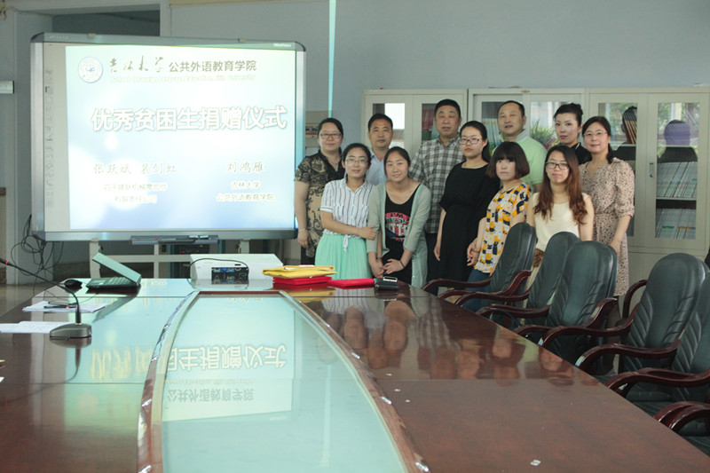 2015年5月26日上午10:00,公共外语教育学院优秀贫困生捐赠仪式在242net官网外语楼六楼会议室举行。出席本次仪式的有四平建跃机械零部件有限责任公司总经理张跃斌先生、裴剑虹女士、公共外语教育学院的刘鸿雁老师、公共外语教育学院党委书记郝贺、行政副院长周晓宇、教科研办公室李欣霜及五名受资助贫困生。会议由郝贺书记主持。