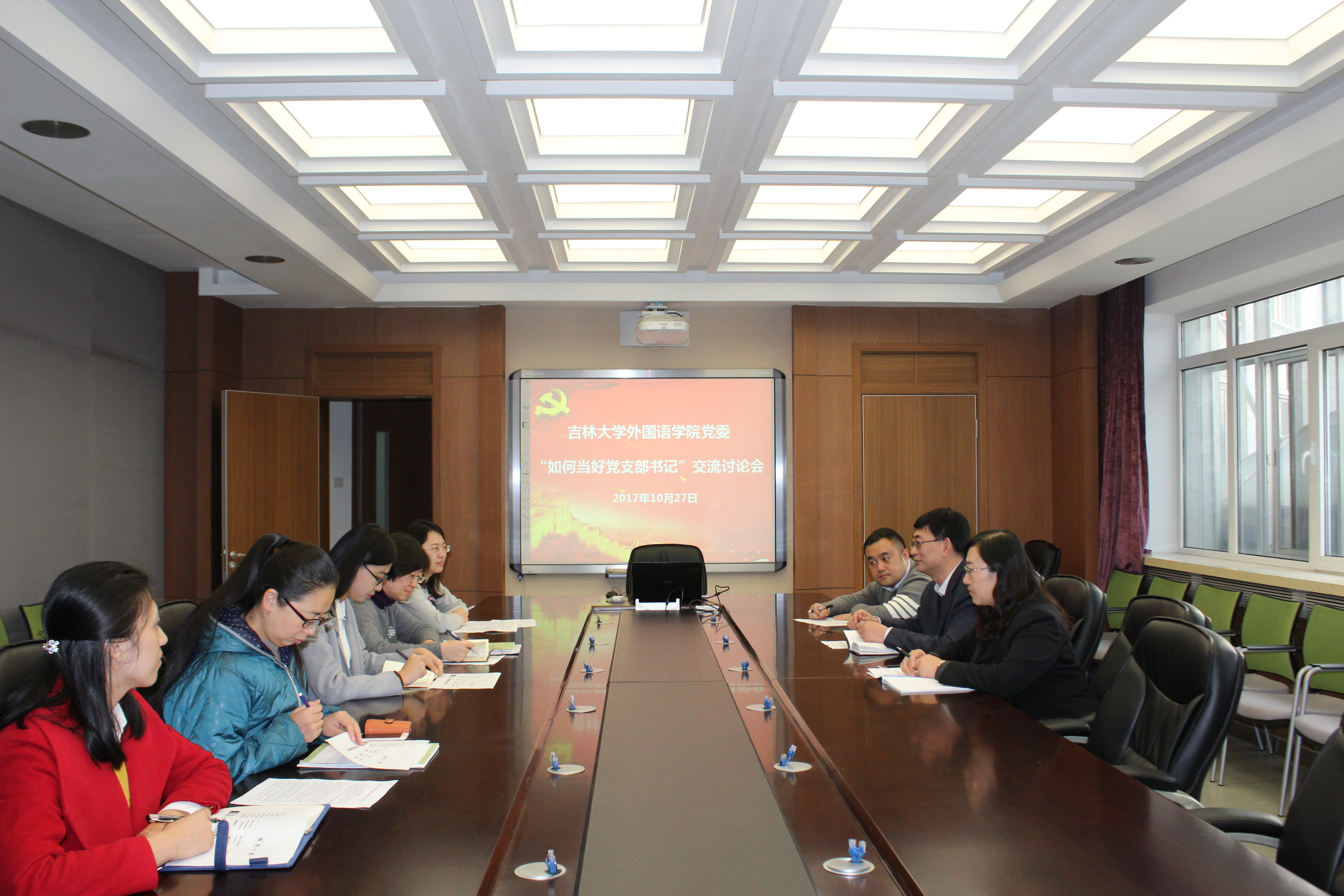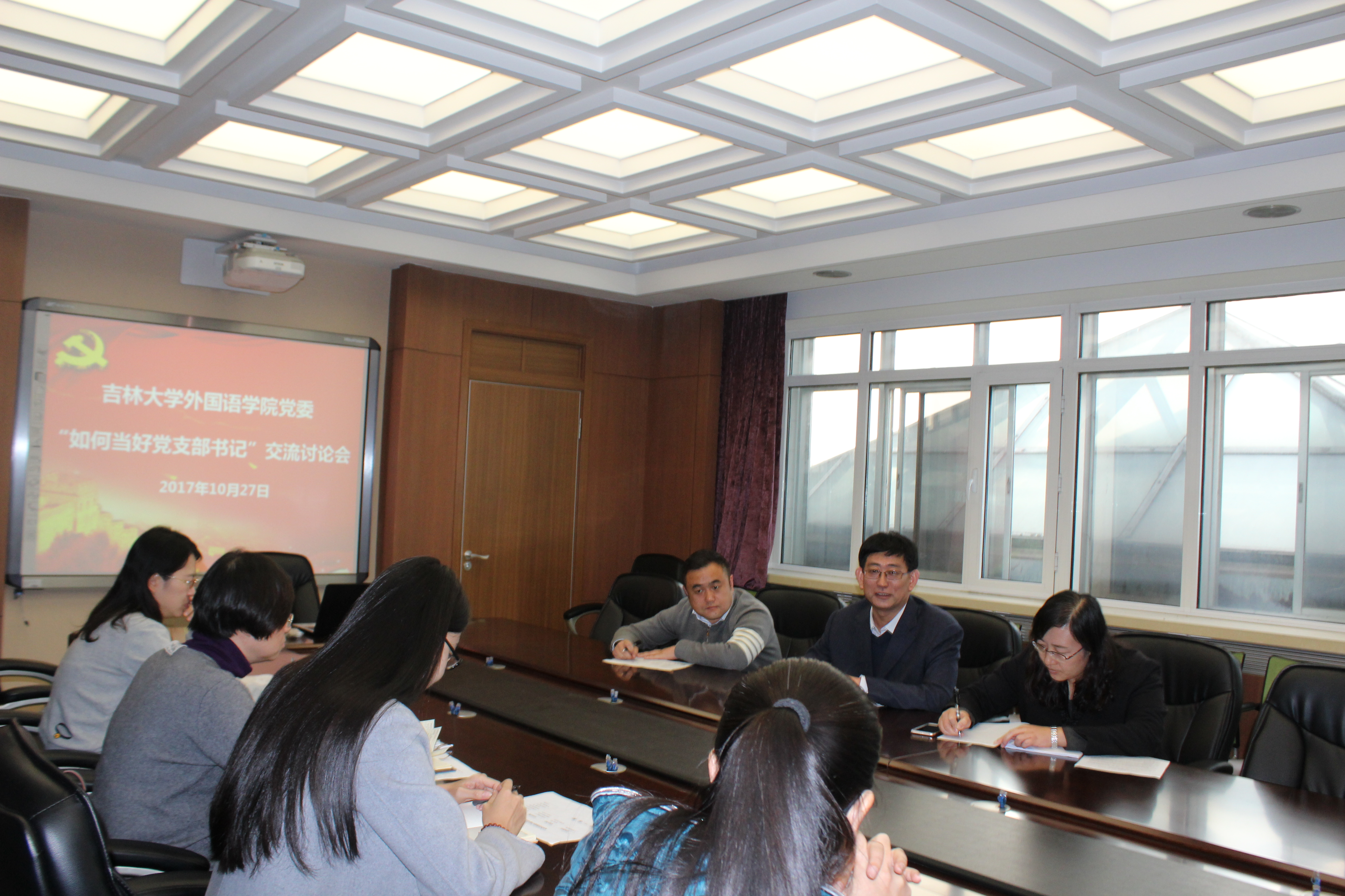 为进一步加强学院党委各党支部建设,推进“两学一做”学习教育常态化制度化,切实增强教工党支部书记的“四个意识”,充分发挥教工党支部书记在基层党建中的重要作用,外国语学院教工党支部书记积极参加了学校组织的集中培训。根据学校培训要求,10月27日下午,外国语学院党委组织教工党支部书记开展培训交流讨论会,学院党委书记刘昌松、党委副书记兼副院长白宇,以及各教工党支部书记参加了会议。