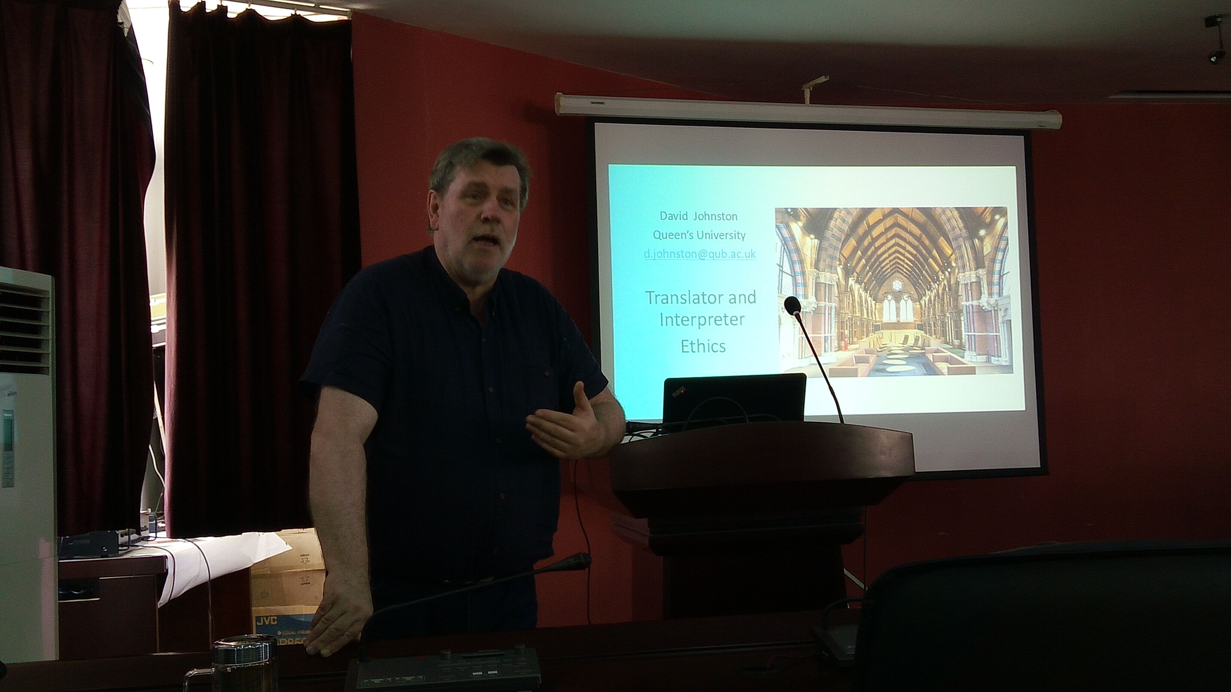 应外国语学院邀请,英国贝尔法斯特女王大学(QUB)艺术英语语言学院翻译中心主任、博士生导师David Johnston教授于5月10-13日来访我校,与外国语学院师生展开学术交流。按计划Johnston教授将在外院举办系列讲座,并与我院就两校对应学院的进一步合作进行交流。