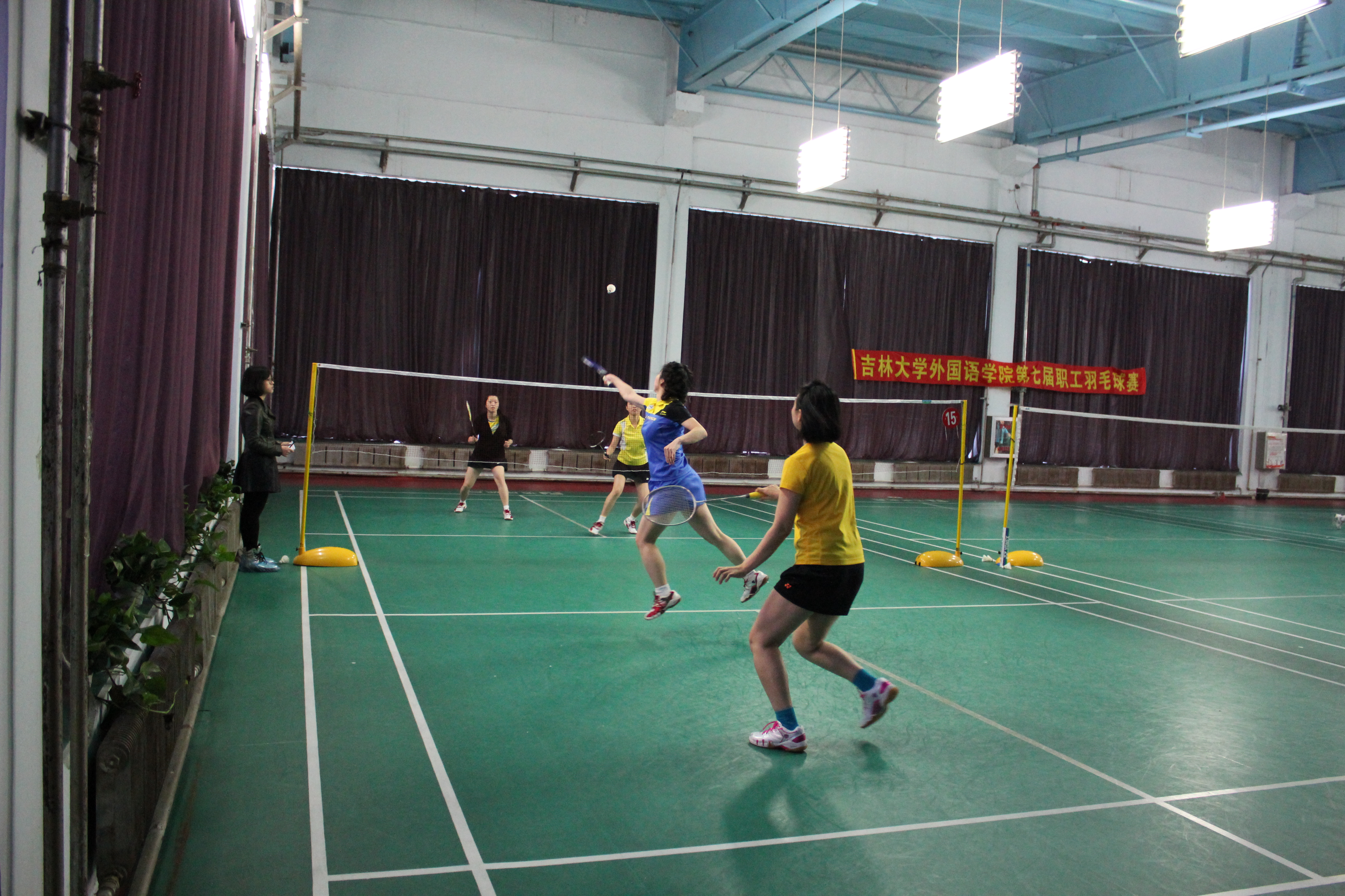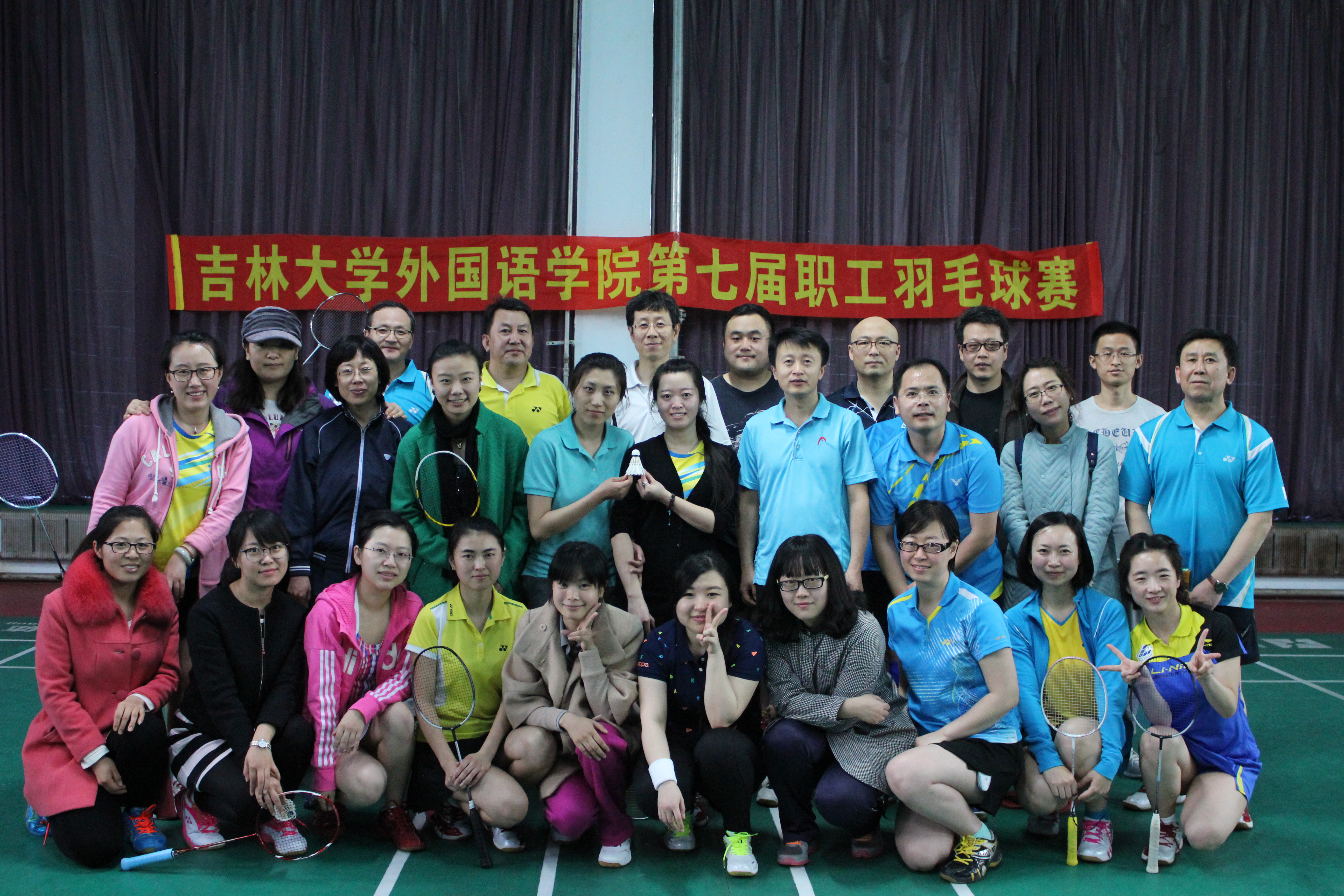 为迎接校职工羽毛球比赛,根据外国语学院2014-2015年度工会计划安排,外国语学院第七届教职工羽毛球比赛于2015年4月8日下午落下帷幕。全院共有31名教职工参加了比赛。比赛分为男单、女单、男双、女双以及混双五个单项进行。