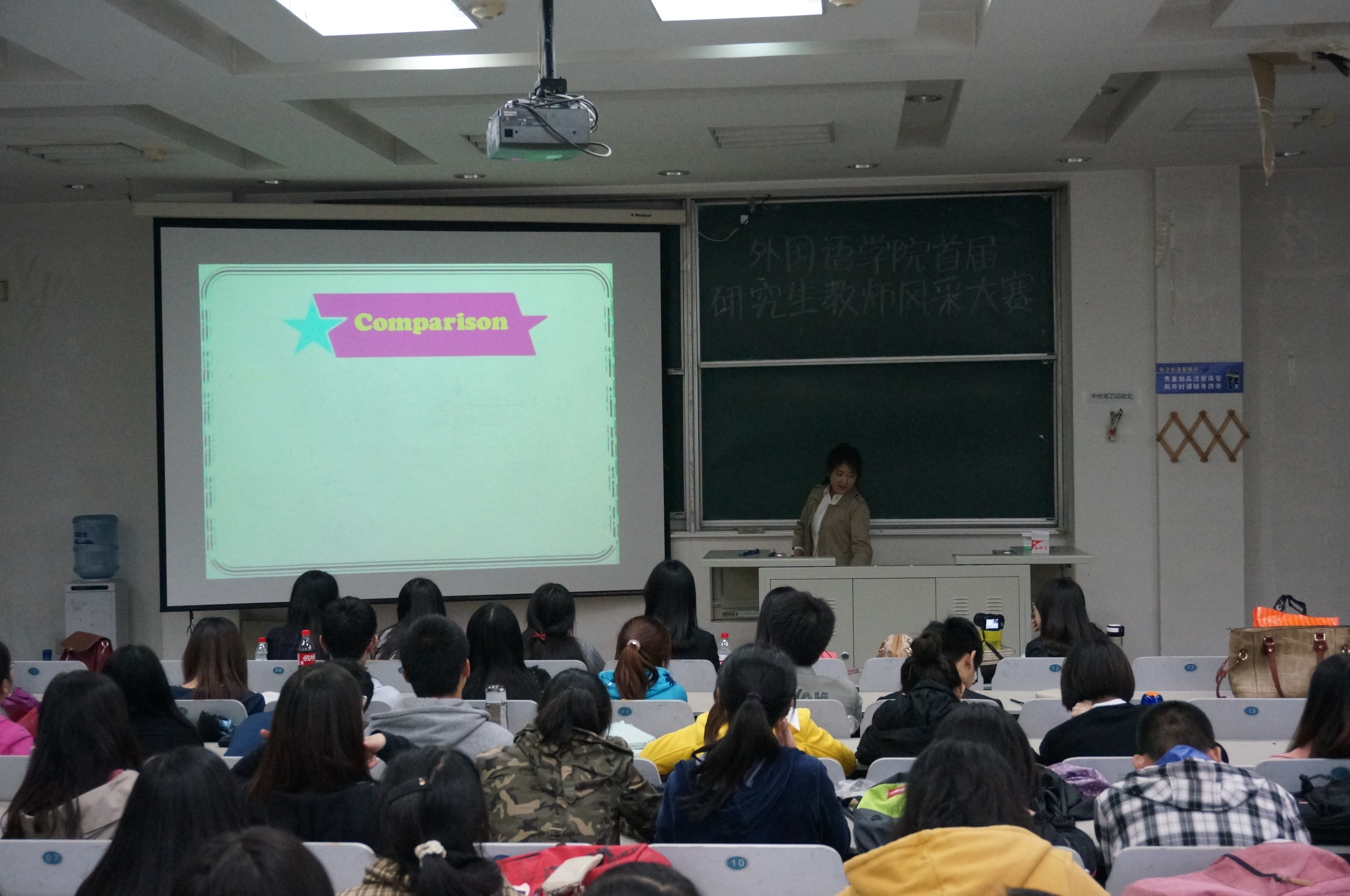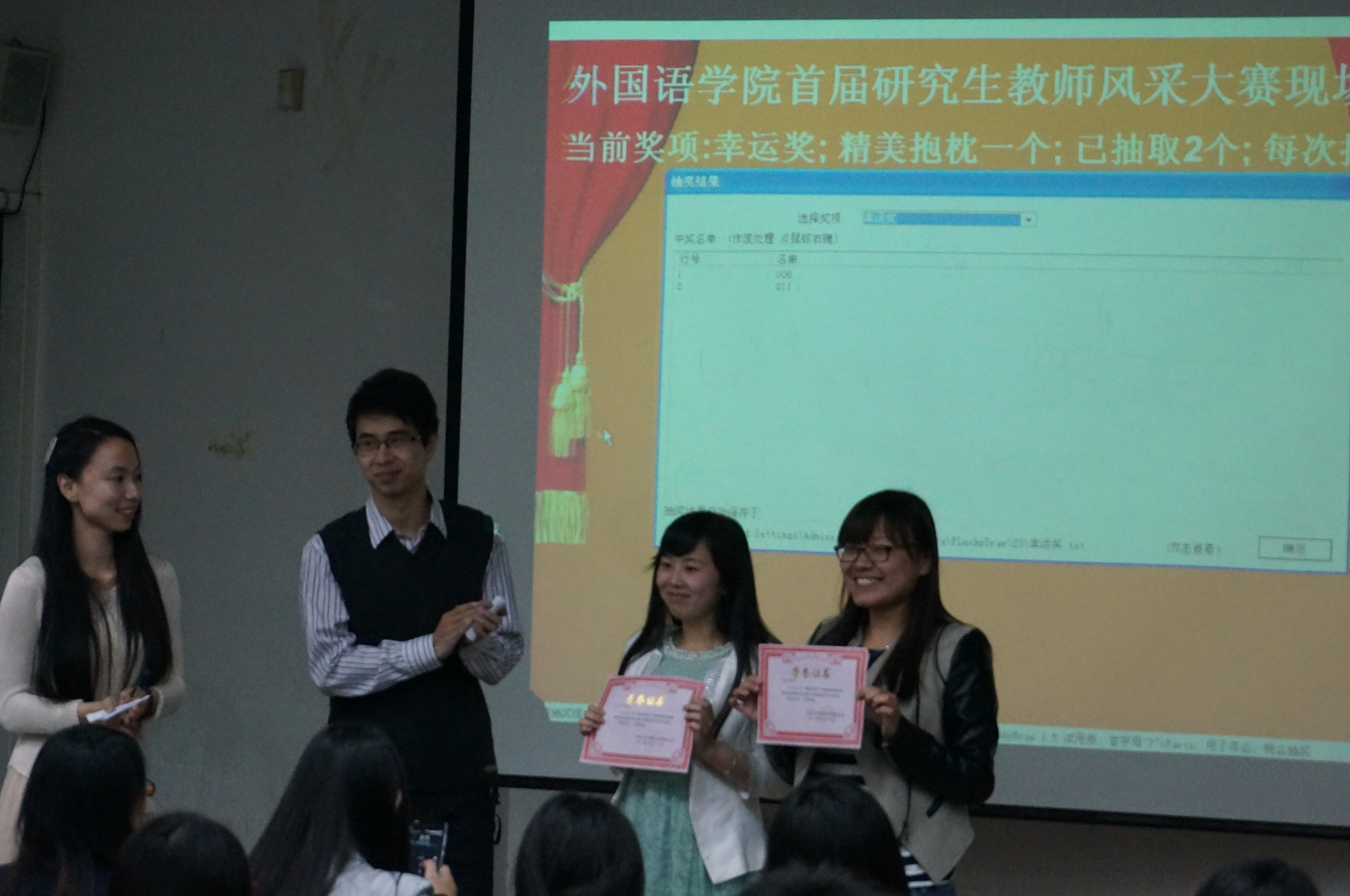 为了增强研究生的综合素质,提高研究生的实践能力,外国语学院于5月15日18:00在逸夫教学楼第六阶梯教室举办了“慎思笃行”外国语学院首届研究生教师风采大赛。学院2013级研究生与本科生代表参加了比赛。 本次大赛分为初赛和决赛两个环节。经过初赛的选拔,八名同学进入到决赛现场。本次决赛中,每名选手有十分钟的现场授课时间,最后由评委根据每名选手的现场表现进行评分和点评, 并且由20名本科学生选出最受学生欢迎的两名教师。决赛中选手们精彩而睿智的现场表现获得了评委老师和现场观众的一致好评。最终,经过评委打分和学生现场投票,2013级西班牙语语言文学专业苑雨舒获得一等奖,2013级英语语言文学专业徐杨、亚非语言文学专业范慧杰获得二等奖,英语语言文学专业李英菀、日语语言文学专业唐家林、俄语语言文学周磊获得三等奖。 外语专业研究生很大部分有未来从事教师行业的意愿,本次活动为学生提供了一个展示自我风采的平台,提升了学生综合素质和实践能力。同时,通过评委们的点评指导和现场观众的意见反馈,同学们了解了自己的实力和弱点,为下一阶段的学习提供了方向。