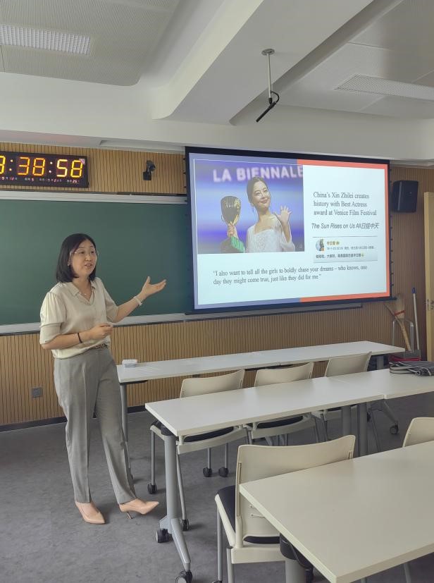 课程思政融入上,她强调结合课文主题自然渗透,如讲解全球化引入“一带一路”案例,体现大国担当,课前展示让学生做有关家国情怀的展示分享,实现以文化人、润物无声。