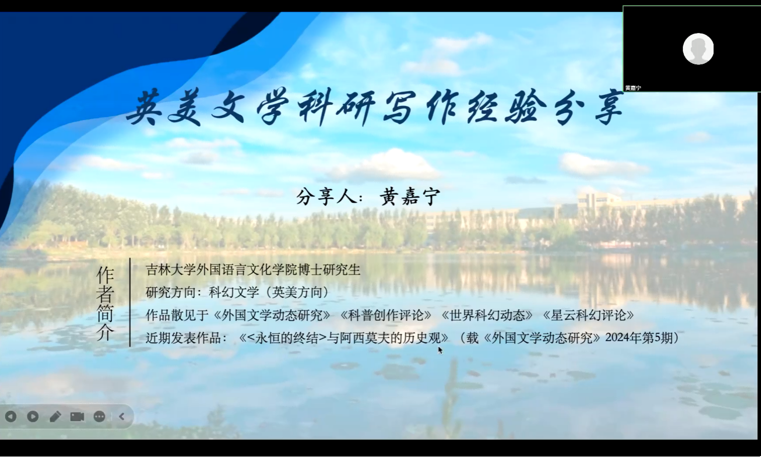 为帮助研究生提升科研写作能力,掌握学术论文撰写规范,2025年9月13日晚,必赢亚州242举办科研写作经验分享会。此次分享会邀请2023级英语语言文学博士黄嘉宁、2023级外国语言学及应用语言学硕士王慧妍和吕辰添三位同学作为分享嘉宾,围绕科研写作方法与技巧、论文写作经验、学术规范等内容展开交流。此次分享会由学院学术文化部邵玉杰主持,研究生辅导员林明帅、2024级和2025级研究生线上参会。